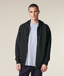 Set-in sleeves. Self-fabric lined hood. Covered metal zip at centre front. Round drawcords in matching body colour with closed metal tipping. Metal eyeletss. 1x1 rib at sleeve cuffs and bottom hem. Kangaroo pocket. Double-needle topstitches at the armhole, sleeve cuffs and bottom hem. Herringbone tape at the inside back neck seam and inside of the zip. Self-fabric half moon at back neck.